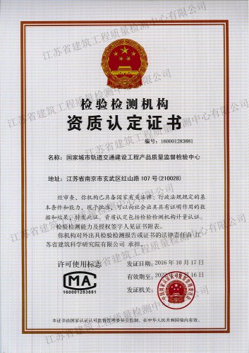 國家城市軌道交通建設(shè)工程產(chǎn)品質(zhì)量監(jiān)督檢驗中心, 依托江蘇省建筑科學(xué)研究院和江蘇省建筑工程質(zhì)量檢測中心在城市軌道交通建設(shè)工程領(lǐng)域的綜合技術(shù)優(yōu)勢,于2016年10月獲得國家認證認可監(jiān)督委員會批準(zhǔn)授權(quán)..